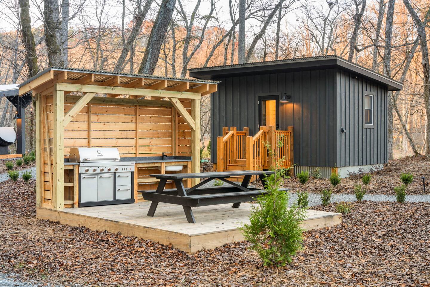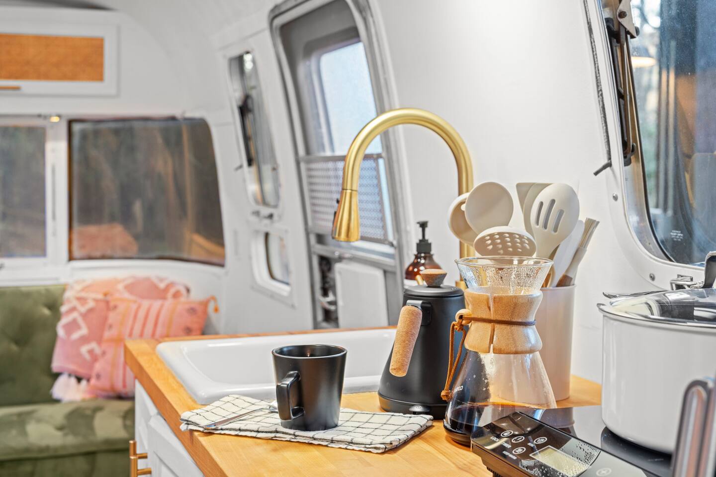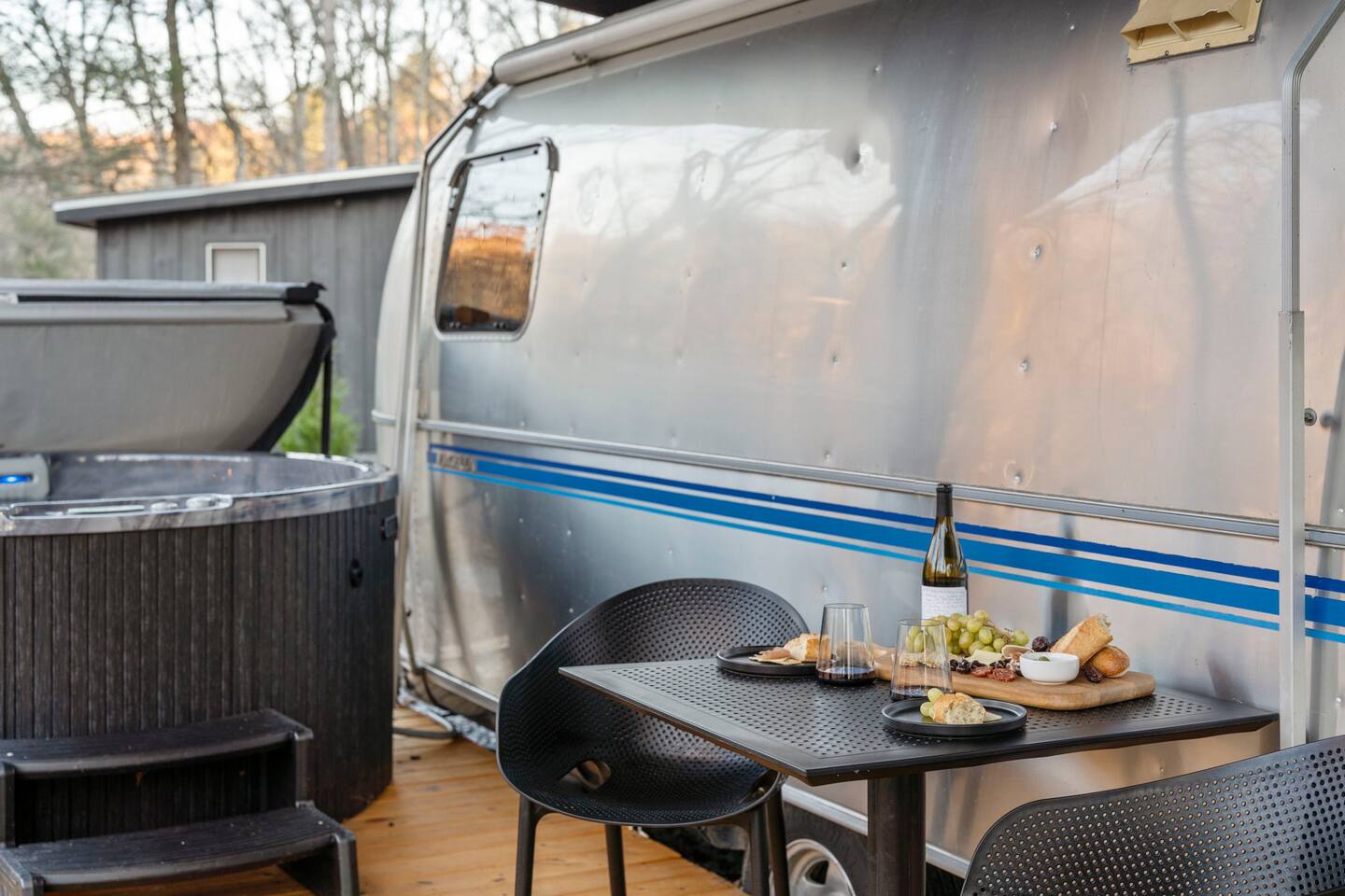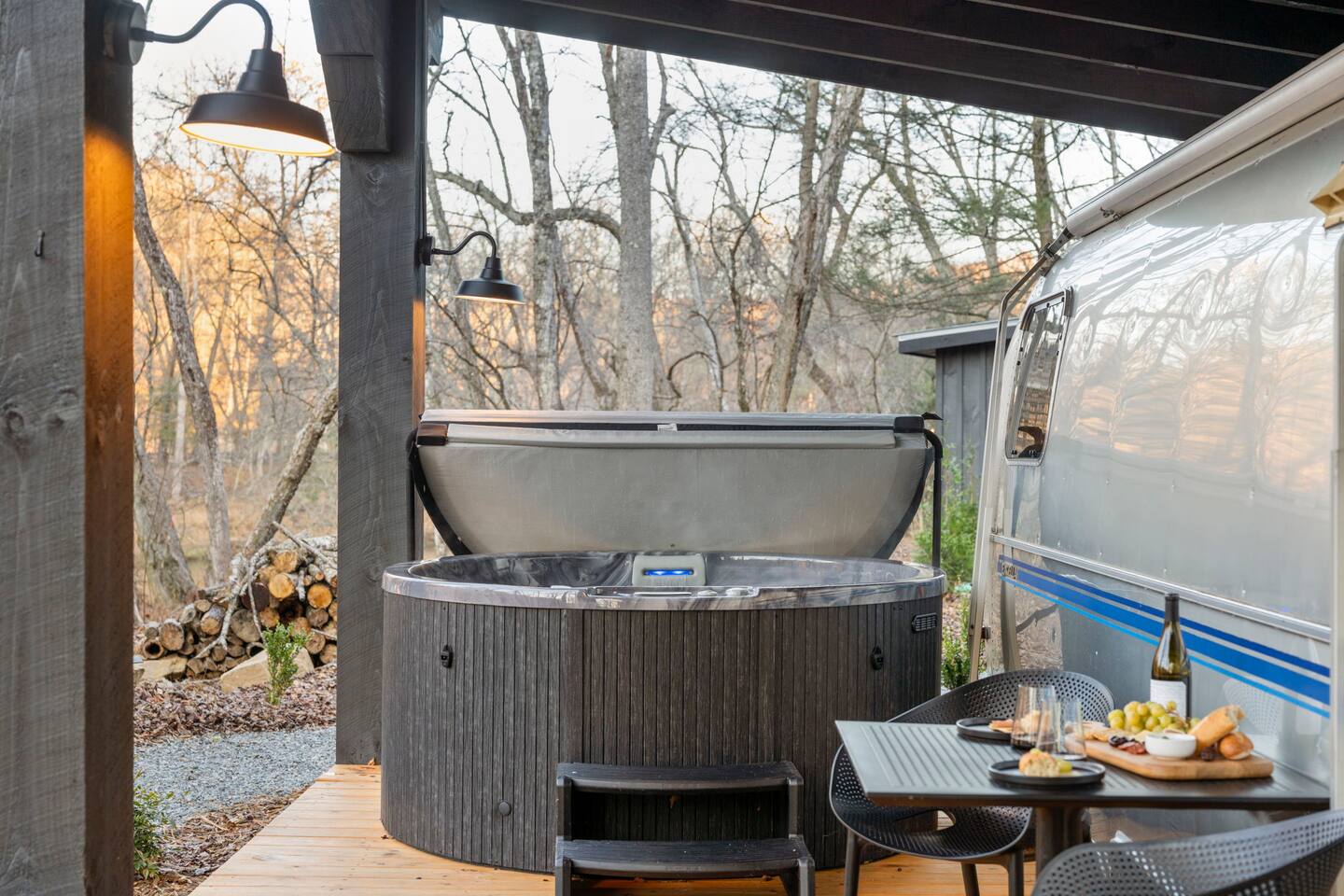 While our Airstream features a convenient single bathroom and shower, perfect for quick refreshes, we also offer access to a separate, luxurious bathhouse for an elevated experience. This shared bathhouse is thoughtfully designed to provide a private full-size shower and bathroom exclusively for each Airstream, ensuring your comfort and privacy. With heated floors and a spacious layout, the bathhouse delivers ultimate relaxation no matter the season. Whether you enjoy the cozy charm of the Airstream or the indulgent amenities of the bathhouse, you’ll have everything you need for a comfortable and refreshing stay. In addition to its charming indoor amenities, the Airstream offers an array of outdoor luxuries to enhance your stay. Unwind in your private hot tub under the stars or gather around the cozy fire pit, complete with comfortable outdoor furniture for relaxing evenings. The outdoor kitchen is fully equipped with a grill, sink, and picnic table, making it easy to prepare and enjoy meals surrounded by nature. This space is designed for both relaxation and connection, ensuring a perfect balance of comfort and outdoor adventure.