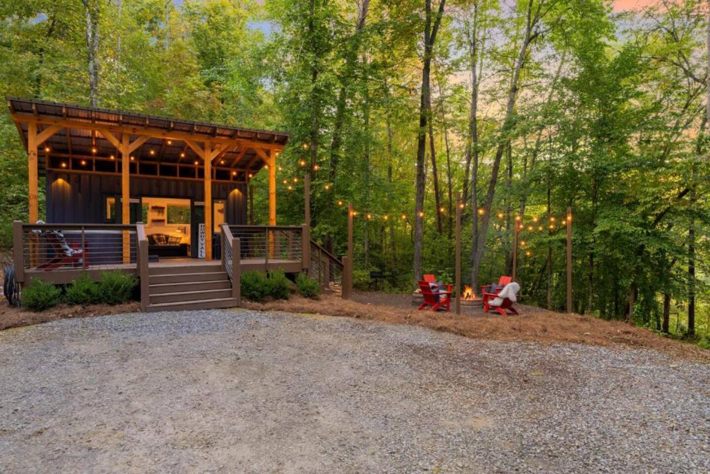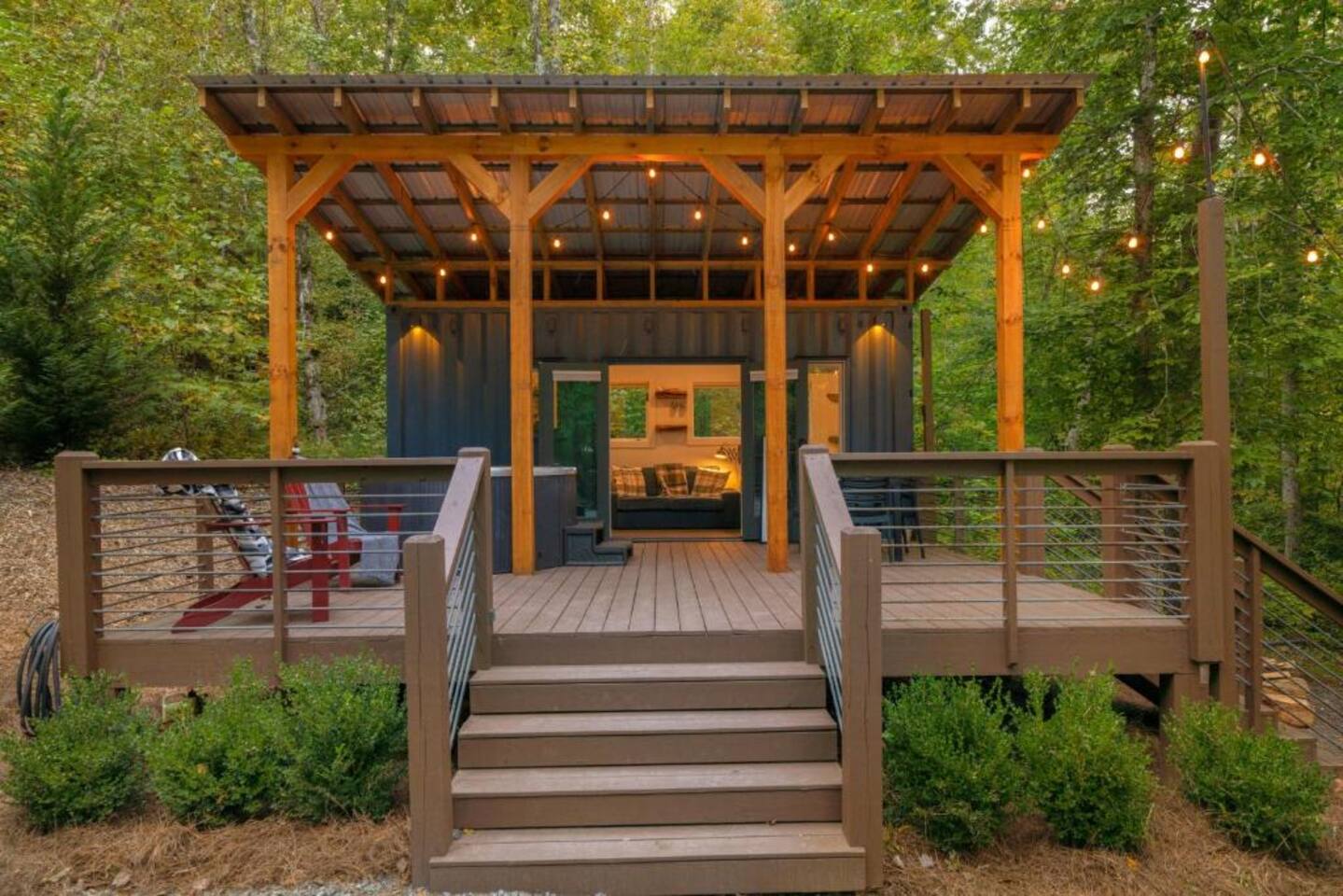 The Container at Camp Toccoa Enjoy a romantic getaway for two at this unique studio nestled along the Toccoa River in Blue Ridge. Formerly a shipping container, this studio was recently converted into a cozy vacation retreat, boasting a spacious deck with a private hot tub, an outdoor dining area, and a riverview firepit. This one-of-a-kind property is the ideal mountain getaway! You'll be five miles north of downtown and only six miles northwest of the Lake Blue Ridge Marina.